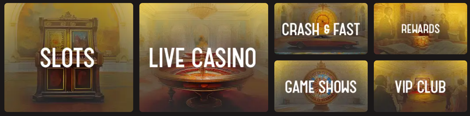 - Game categories (Slots, Live, Tables, Crash & Fast, Video Poker, Scratch Cards, Tournaments)