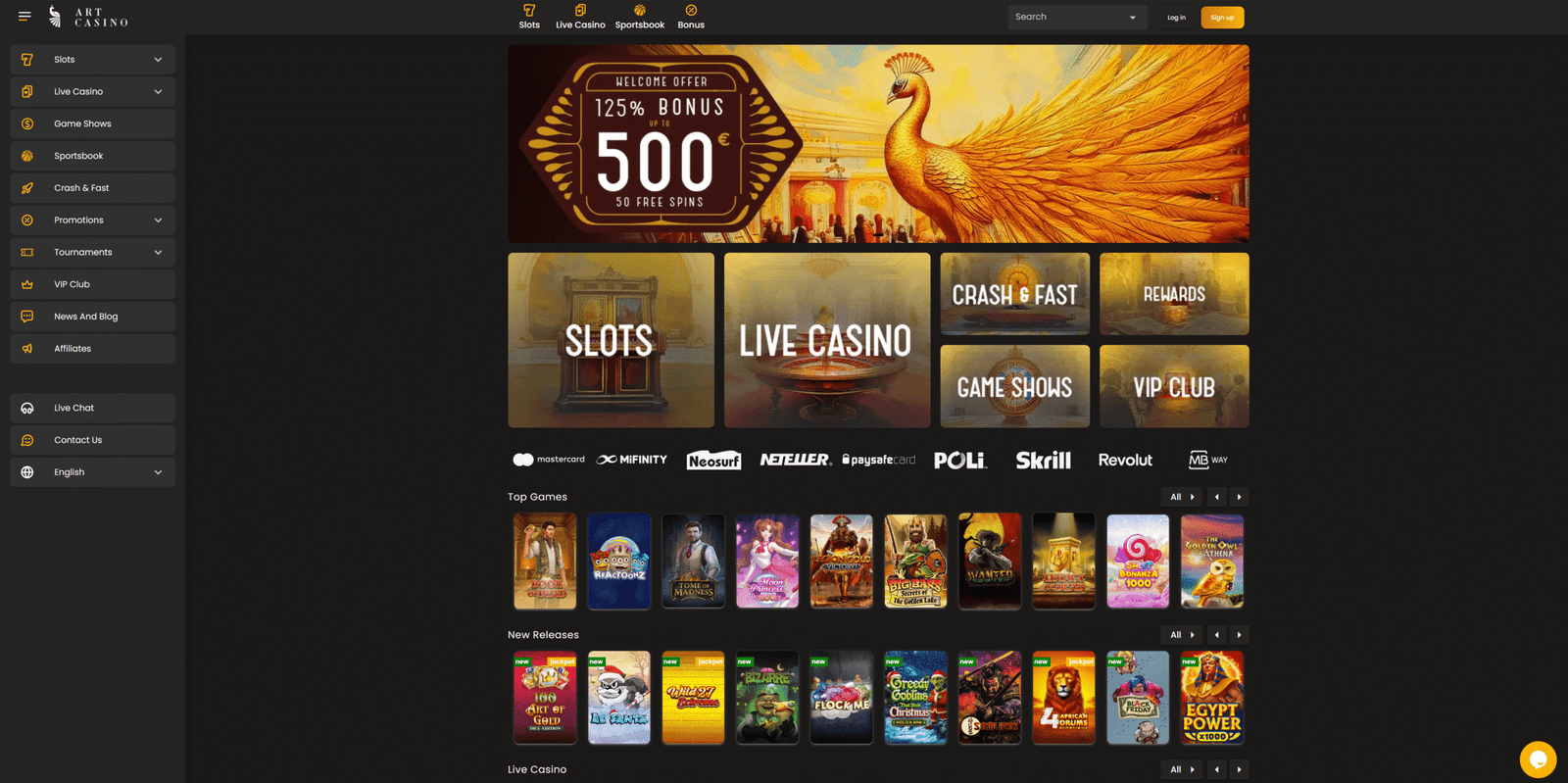 Art Casino emerges as a meticulously engineered gaming platform combining artistic design principles with an expansive content ecosystem. Launched in 2022 by Modern World Entertainment B.V. — a subsidiary within the distinguished Versus Odds portfolio managing 20+ gaming brands — Art Casino underwent a significant visual redesign in early 2025, transforming from an outdated aesthetic to a sophisticated black-and-gold theme with uniquely illustrated graphics.
